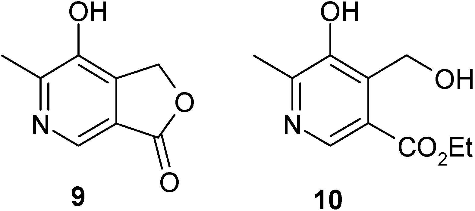 A variety of conditions were screened and the results are reported in Table 1. The best conditions found for complete reduction utilized 10-15 equiv. MeSiH(OEt)2, either neat or in dioxane, 10 mol% Bu4NF and 100 °C for circa 24 h (Table 1, exp. 10 and 13). These conditions afforded at best a 50-54% isolated yield of vitamin B6 free base and up to 18% of the intermediates. These partially reduced products were either characterized by comparison to known compounds, lactone (9) [56], or observed in GC/MS experiments, mono reduced (10) (Figure 1). Based on another publication [57], Bu4NF was replaced by the combination of 10 mol% CsF and 20 mol% 18-crown-6 ether. It was proposed that this would increase the nucleophilicity of the fluoride as a “naked” anion and improve the reaction. However, under these modifications the reaction still required 24 h at 100 °C for completion and afforded a similar LC yield of 52% (Table 1, Exp. 14).