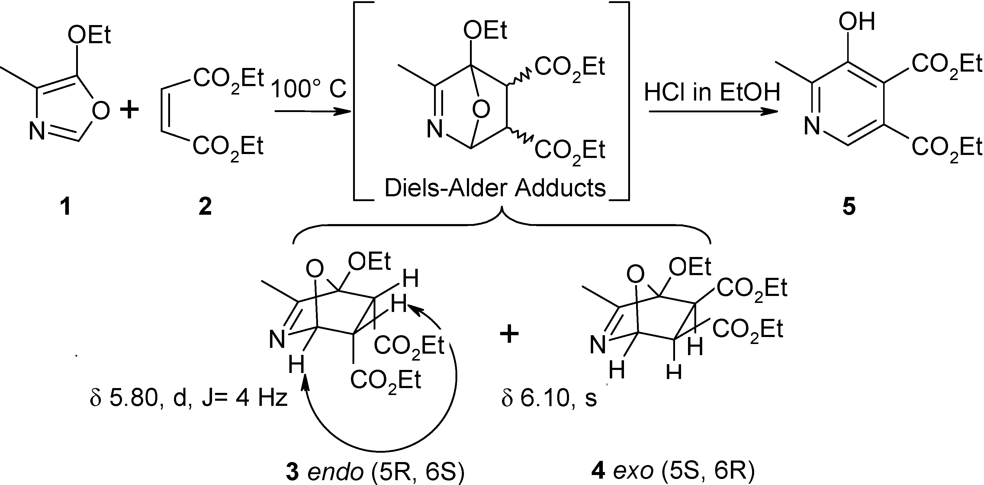 Isolation of Diels-Alder adducts endo (5R,6S)-4-ethoxy-3-methyl-7-oxa-2-aza-bicyclo[2.2.1]hept-2-ene-5,6-dicarbocyclic acid diethyl ester (3) and exo (5S,6R)-4-ethoxy-3-methyl-7-oxa-2-aza-bicyclo[2.2.1]hept-2-ene-5,6-dicarbocyclic acid diethyl ester (4).