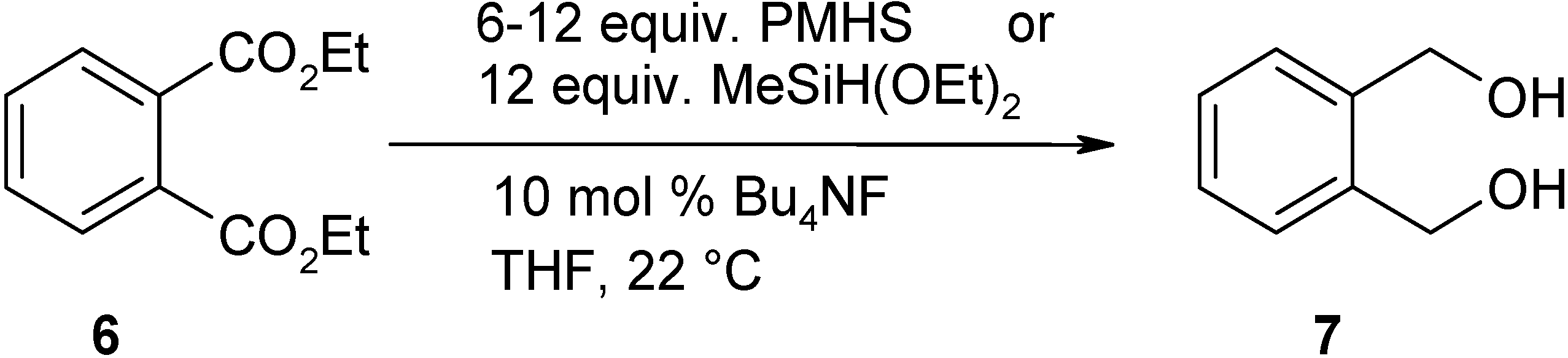 In a model experiment, diethyl phthalate (6) was easily reduced using Lawrence’s conditions [50] (THF, 6 equiv. PMHS, 10 mol% n-Bu4NF, 22 °C) to afford 1,2-benzenedimethanol (7) in 47% isolated yield (Scheme 2). The isolated yield was increased to 64% when 12 equiv. of PMHS were used. Replacing PMHS by 12 equiv. of the monomer silane, MeSiH(OEt)2, afforded a comparable isolated yield of 62%. The model system was advantageous because the diol product (7) could be extracted into an organic solvent, and thus readily isolated. With this positive result, the conditions were then applied to the more challenging hydroxypyridine diester derivative (5).
