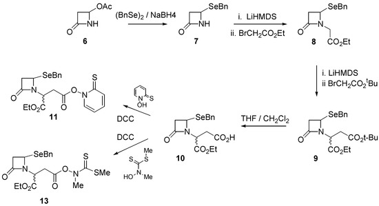 Our synthetic route began with commercially available 4-acetoxy-2-azetidinone (6) which was reacted with, sodium benzylselenoate, prepared by treatment of dibenzyldiselenide and sodium borohydride, to give 4-(benzylseleno)-2-azetidinone (7) in quantitative yield. Further reaction with ethyl bromoacetate under alkaline conditions (LiHMDS) afforded ester 8 in good (88%) yield. Ester 8 was further reacted with several equivalents of t-butyl bromoacetate under alkaline conditions to provide the mixed diester 9 in 74% yield. Selective hydrolysis of the t-butyl ester in a 1:1 mixture of trifluoroacetic acid and dichloromethane afforded the monoacid 10 in quantitative yield. Further reaction of 10 with N-hydroxypyridine-2-thione in the presence of dicyclohexylcarbodiimide (DCC) afforded the pyridinethioneoxycarbonyl (PTOC, Barton)[11] ester free radical precursor 11 (Scheme 1).