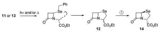The Barton ester proved to be quite labile and was not purified. Rather, a concentrated solution of 11 was transferred into benzene, after which irradiation with a tungsten lamp for about two hours resulted in a distinct colour change and the appearance of several components by TLC. The dominant TLC spot was isolated and characterized and proved to be the required ethyl 1-aza-7-oxo- 4-selenabicyclo[3.2.0]heptane-2-carboxylate (12) which was isolated in 35% yield (based on 10) as an inseparable mixture of diastereoisomers (Scheme 2). Attempts to improve the yield through irradiation at 0° or at reflux, or thermolysis in the dark did not result in any significant improvement. Presumably 12 arises through a mechanism involving intramolecular homolytic substitution at selenium (Scheme 2).