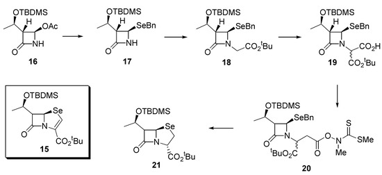 While the synthesis described above affords the general core structure of a β-lactamase inhibitor, we were also interested in the preparation of selenium-containing analogues of penem β-lactam antibiotics (eg. 15). To that end, the commercially available, optically pure, 4-acetoxy- azetidinone 16 was converted into the benzylseleno derivative 17 as described above for the preparation of 7, with complete retention of configuration (de > 98%). Because of the susceptibility of the protecting group in 17 to acidic workup, it was necessary to subtly change the order in which the subsequent steps were executed to that described in Scheme 1. The selenide 17 was reacted with t-butyl bromoacetate under alkaline conditions (LiHMDS) to afford the ester 18 in 86% yield. Subsequent reaction with ethyl bromoacetate and LiHMDS, followed by careful barium hydroxide hydrolysis provided the acid 19 as a 7:1 mixture of diastereoisomers in 68% yield. Further conversion of 19 into the thiohydroximate ester 20 and photolysis as described above afforded the required selenapenam 21 in 35% yield (based on 19) (Scheme 3). Once again, NMR spectroscopy provided evidence for the formation of 21, in particular, the penam displayed a signal at δ 279.8 in its 77Se-NMR spectrum.