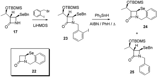 Finally, with the aim of exploring other biologically important selenium heterocycles, we considered the feasibility of preparing benzo-fused systems such as that found in 12,2a-dihydro- 1H,8H-azeto[2,1-b][1,3]benzoselenazin-1-one (22). Therefore, 17 was reacted with 2-(bromo- methyl)iodobenzene under alkaline conditions to afford the aromatic iodide 23 in 65% yield. Reaction with triphenyltin hydride (0.015M) under standard radical conditions (AIBN, refluxing benzene) afforded the required product 24 in 59% yield, together with the uncyclized (directly reduced) byproduct 25 demonstrating, once again, that intramolecular homolytic substitution chemistry is a versatile method for the construction of selenium-containing rings (Scheme 4). Selenide 24 exhibited a signal at δ 311.8 in its 77Se-NMR spectrum.