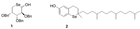 Free-radical homolytic substitution chemistry is rapidly gaining acceptance as a versatile synthetic method [1]. Over the past few years, we have demonstrated the effectiveness of this chemistry for the preparation of selenium and tellurium-containing higher heterocycles. Indeed, so versatile is the free-radical approach that many classes of compound including some of hitherto unknown structure have been successfully prepared. Among these are included 5-deoxy-5-seleno pyranose sugars (eg. 1) [2], and novel selenium and tellurium analogues (eg. 2) [3] of the important antioxidant, α-tocopherol.