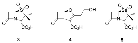 A common mechanism of resistance in bacteria to the β-lactam class of antibiotics is through the β-lactamase enzymes [6,7]. These enzymes hydrolyse β-lactam antibiotics, rendering them impotent. Several β-lactamase inhibitors, such as sulbactam (3) and clavulanic acid (4) are known, are able to be administered in conjunction with antibiotics susceptible to β-lactamase activity [8].