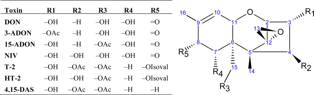 - Rotter, BA; Prelusky, DB; Pestka, JJ. Toxicology of deoxynivalenol (Vomitoxin). J. Toxicol. Environ. Health 1996, 48, 1–34. [Google Scholar]