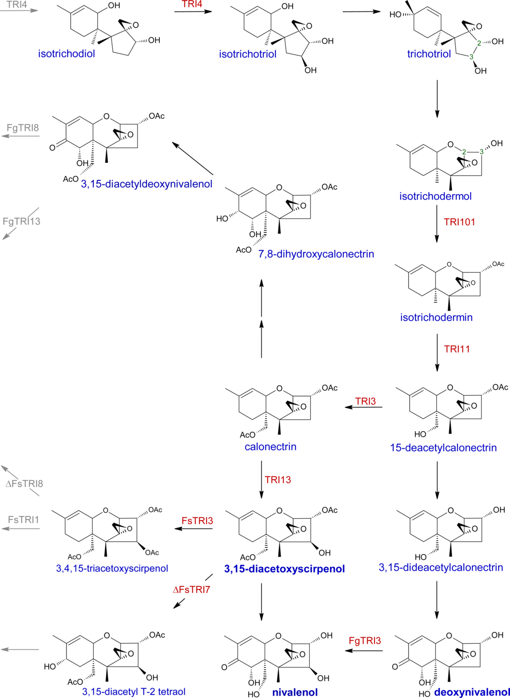 | Tri13 | Core Tri | monooxygenase; functional F. graminearum TRI13 required for NIV-chemotype | [49, 161] |