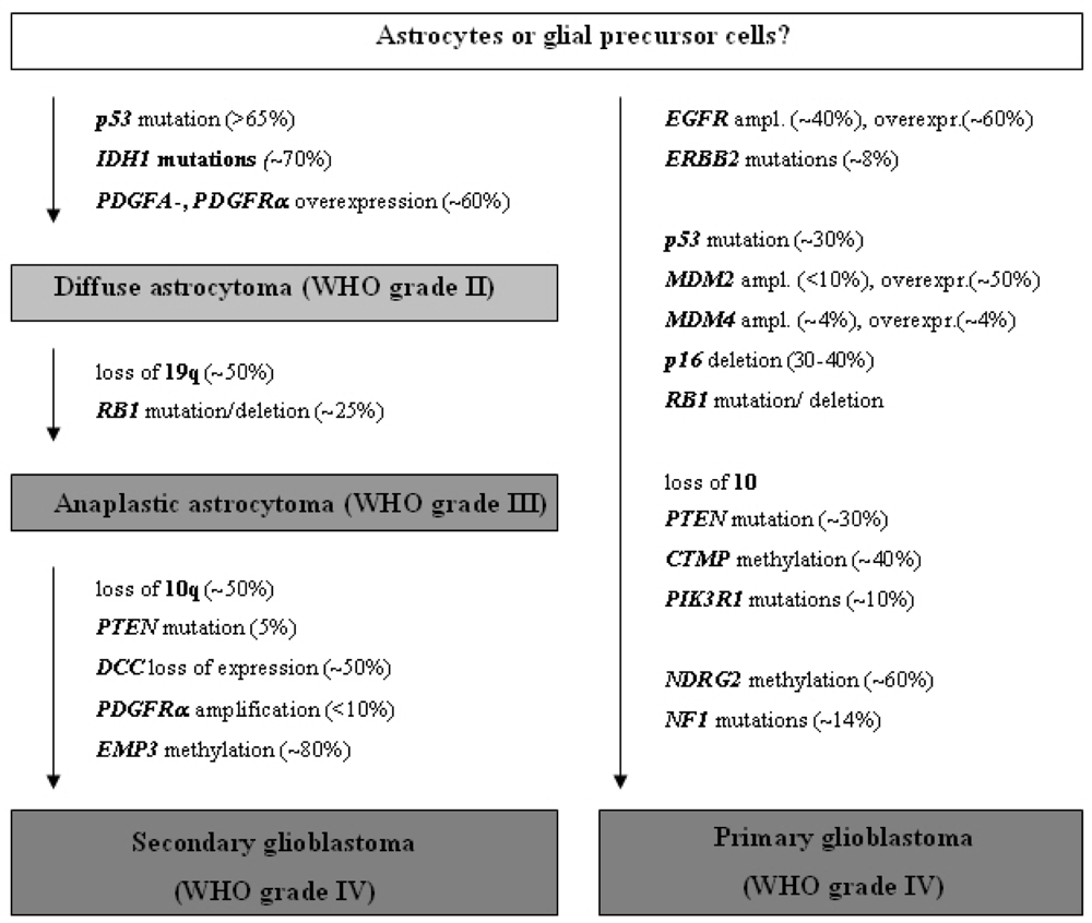Schematic representation of the molecular pathogenesis and progression of diffusely infiltrating astrocytic gliomas.
