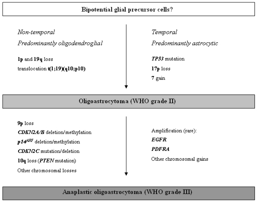 Schematic representation of the molecular pathogenesis and progression of oligoastrocytomas.