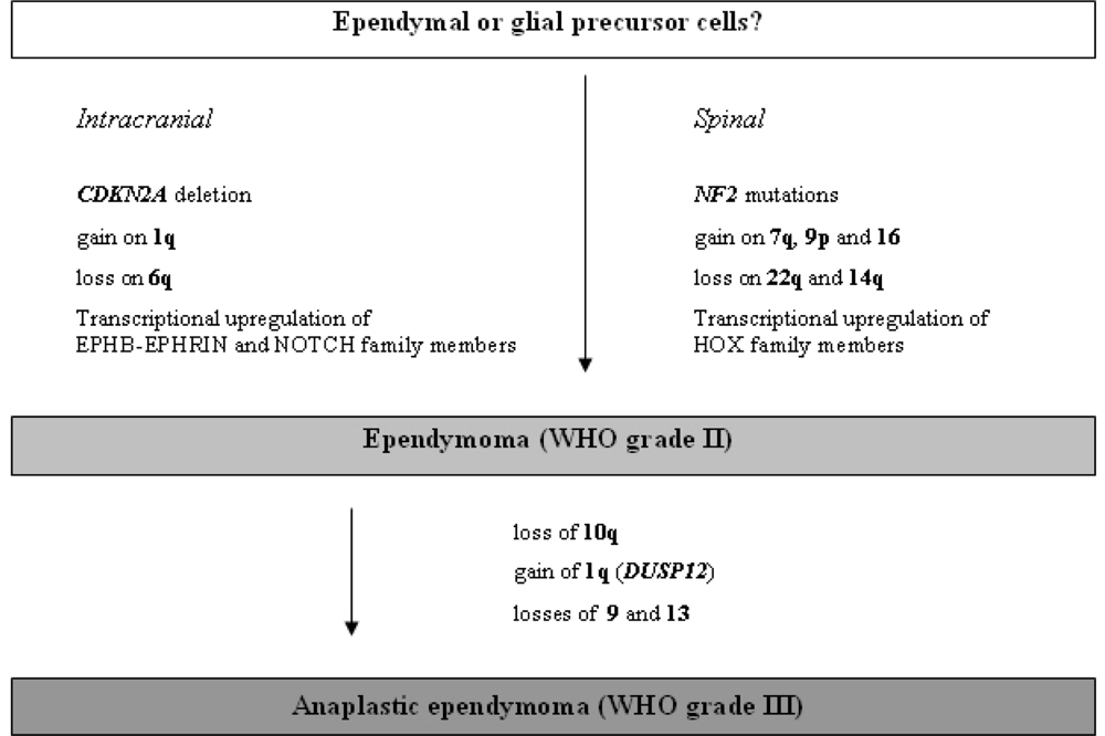 The molecular changes observed in anaplastic ependymomas are fairly similar to those observed in their low-grade counterparts. Though to a certain extent malignant progression in ependymomas may occur, only few molecular changes have been pinpointed that are more or less exclusively associated with a high-grade ependymoma phenotype. In an analysis of 23 anaplastic ependymomas, loss of chromosome arm 10q appeared overrepresented [107]. Also, gain of 1q, with DUSP12 on 1q23 as a potential target gene [105], as well as losses of 9 and 13 were associated with WHO grade III lesions [113] (Figure 5). In regard to tumor location, mRNA expression analysis distinguished between supratentorial WHO grade II and III tumors. In contrast, infratentorial ependymomas could not that easily be graded by their mRNA expression profiles, suggesting that in this location WHO grade III tumors differ by relatively few genetic changes from WHO grade II tumors [114].