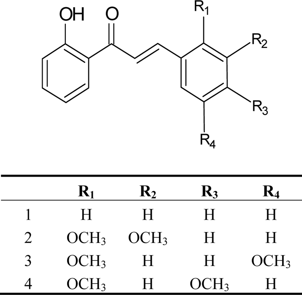 The structures of the studied compounds 1–4 are given in Figure 1. The dimethoxy substituted 2’-hydroxychalcones 2–4 were synthesized by the Claisen-Schmidt condensation of 2`-hydroxy-acetophenone and the appropriately substituted dimethoxybenzaldehyde in basic media (KOH) as described previously by Quintana et al. [24] The 2’-hydroxychalcone 1 was purchased from Merck and used without further purification. These chalcones were dissolved in dimethylsulfoxide and then added to the culture medium.