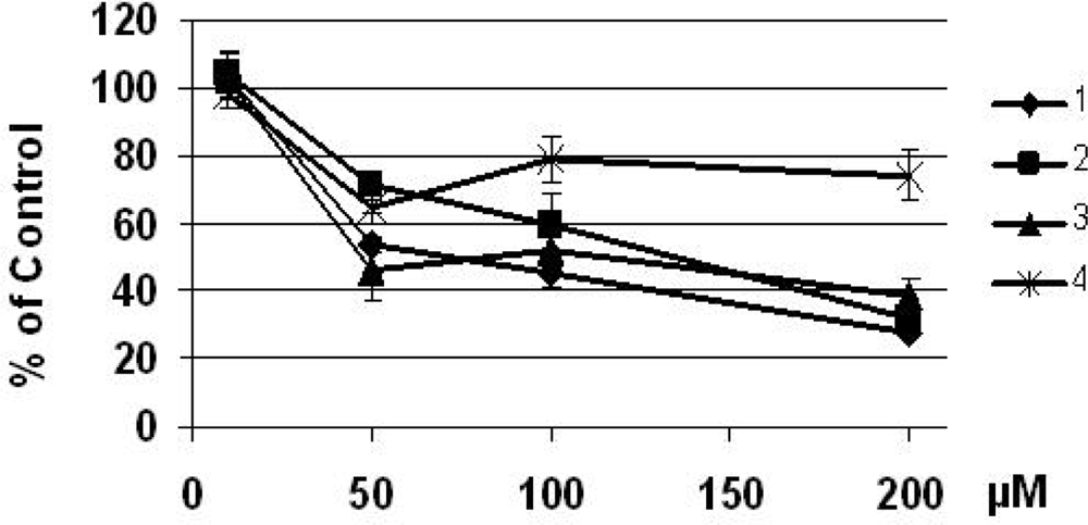 In the present work synthetic 2`-hydroxychalcones containing different methoxy substitution patterns on ring B as shown in Figure 1 were tested to assess their capacity to inhibited cell growth in HepG2 hepatocellular carcinoma cells lines. HepG2 have been used successfully in a number of antitumor studies [12]. First we determined the inhibitory effects of 2`-hydroxychalcones on HepG2 cell proliferation. As shown in Figure 2, 24 h of treatment of HepG2 cells with 2`-hydroxychalcones resulted in a dose-dependent inhibition of cell proliferation. All 2`-hydroxychalcones tested inhibited cell growth at 50 μM and caused a noticeable decrease in the number of viable HepG2 cells by about 50% compared with the control, and with a higher concentration (200 μM), the viability decreased by ca. 80%, except for 2`-hydroxychalcone 4 were the cell growth augmented by ca. 50%.