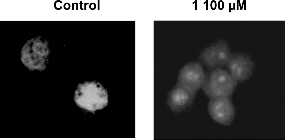 To assess these, first we treated the HepG2 cells as shown in Figure 2 and we analyzed the internucleosomal DNA fragmentation. As shown in Figure 3, typical apoptosis ladder DNA patterns were observed for all four different 2`-hydroxychalcones tested. In treatments containing compounds 1 to 3 a DNA ladder were produced in all concentrations tested. In contrast, 2`-hydroxychalcone 4 only showed DNA fragmentation at 200 μM. When we analyzed the nuclear morphology under a fluorescence microscope, a chromatin condensation was evident in 2`-hydroxychalcone-treated cells compared with the control, were DNA remained dispersed in the nucleus (Figure 4). These results suggest that chalcones 1 to 3 are capable of inducing apoptosis in HepG2 cells.