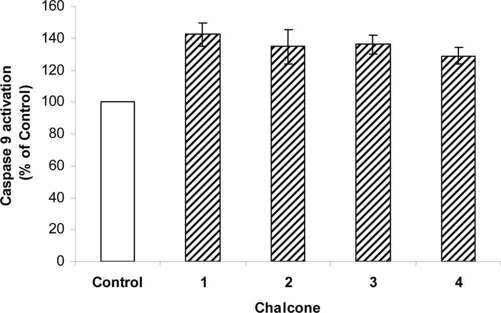 Chalcones induces activation of caspase-9. HepG2 cells treated with chalcone (200 μM) were analyzed for caspase activity after 24 h incubation. The results of studies are expressed as mean values ±SD from four separate experiments (-P<0.05).