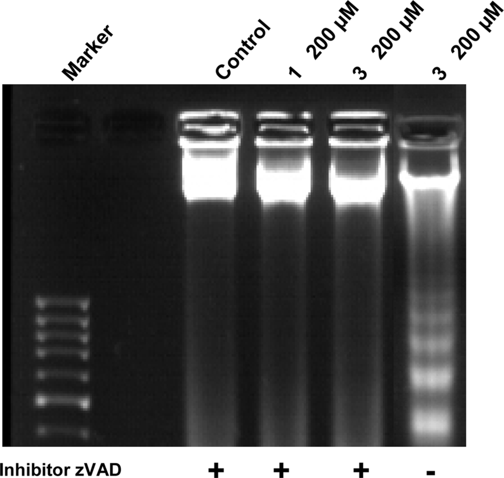 Chalcone induced apoptosis of HepG2 cells depends on the activation of caspases. Cells were treated with zVAD (50 μM) for 2 h and then incubated with chalcones 1 and 3 (200 μM) for 24 h. (cases marked by +). When the cells were incubated in absence of inhibitor (case -), typical laddering indicative of apoptosis was observed. Only representative compounds 1 and 3 are shown, but similar activity were found for all compounds tested.