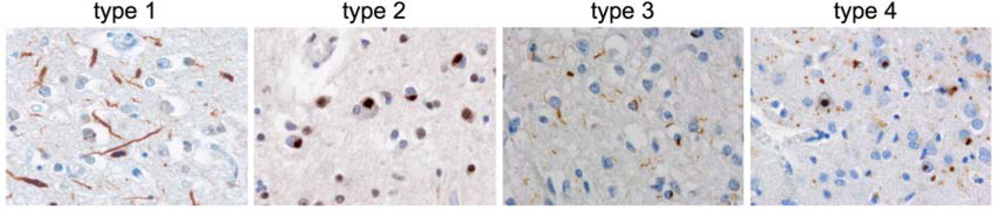 Distinct histological subtypes of TDP-43-positive FTLD-U (“FTLD-TDP”).Immunohistochemistry with antibody against TDP-43 showing the characteristic cortical inclusions in the distinct FTLD-TDP subtypes (numbering according to Sampathu et al. [12]).