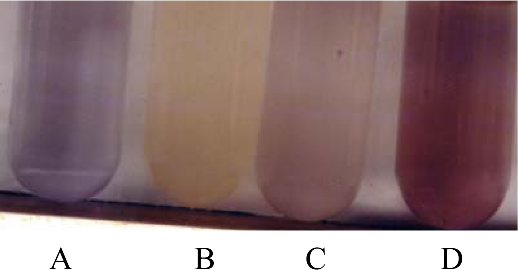 Detection of M. neoaurum exochelin in spent supernatants of M. neoaurum grown in iron-deficiency, zinc-deficiency and iron-sufficiency.CAS assay of exochelin in spent supernatant of M. neoaurum grown in iron-deficiency (B), zincdeficiency (C) and iron-sufficiency (D) conditions as described in the Experimental Section (4.3). Control experiment (A) was carried out by mixing the uninoculated medium with CAS solution. Formation of yellow solution in CAS assay indicates presence of exochelin.