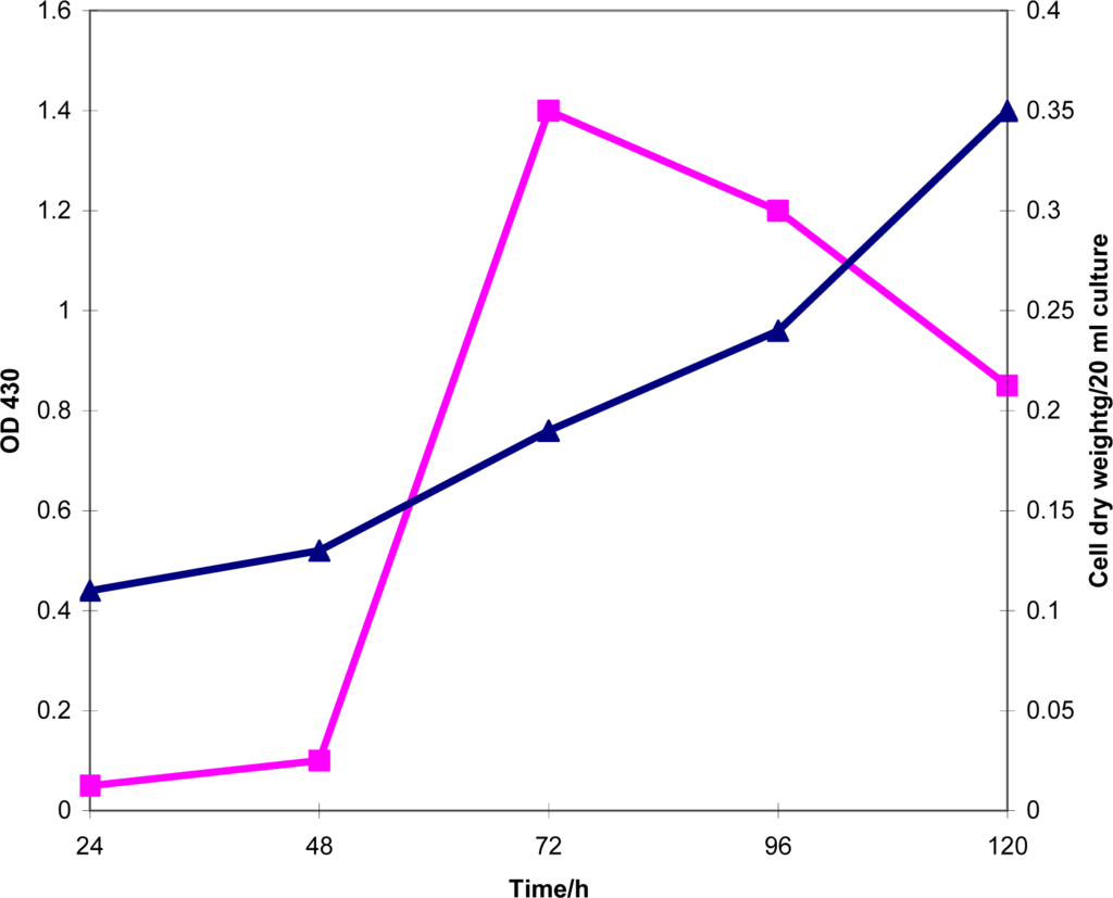 To determine the appropriate incubation time for maximum exochelin production in l-asparagine medium when grown under iron-deficiency (0.02 μg Fe(III)/mL) conditions, M. neoaurum cells were incubated at 37 ºC up to 120 h. Under this condition, exochelin production accelerates during active cell growth (within 24 to 48 h) and achieved the highest (OD430 >1.3) when incubated for 72 h with vigorous aeration (Figure 2). Exochelin concentration decreases gradually after 72 h (Figure 2).