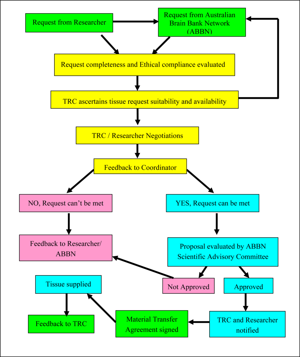 In 1994 the Australian government provided funds to establish a number of brain banks in different states to encourage more studies in the important field of mental health disorders, one of which was the New South Wales Tissue Resource Centre (TRC). It has since grown from a small collection of mostly formalin-fixed human postmortem brain tissue samples used for intramural research projects, into one of the leading brain banking facilities globally. The TRC provides both fixed and freshly frozen human brain tissue for Australian and international investigators. The collection focuses on schizophrenia and allied disorders, and diseases related to alcohol use. Importantly, the TRC also acquires ‘normal control’ cases, an invaluable comparison group. For all cases, inclusion and exclusion criteria are stringently applied [7]. Since its establishment, the TRC has supported around 280 tissue requests from 120 different neuroscience research groups worldwide. The TRC maintains strong ethical principles, and policies and procedures have been developed to ensure that they reflect community standards and meet legal requirements. This includes the complex issue of obtaining consent from donors and their families. An independent Scientific Board reviews all tissue requests from researchers focusing on the scientific merit and feasibility of the projects.