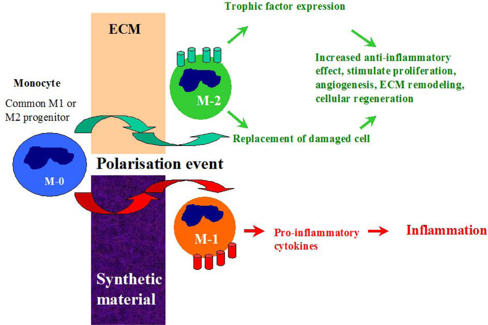 After graft implantation into the host, monocytes from the circulatory system are attracted to the site and may undergo distinctive pathways of differentiation (polarization) into either classically activated M-1 macrophages or the alternative M-2 phenotype []. This process is highly dependent on the graft material properties [,,]. During interaction with synthetic graft materials, monocytes activate M-1 inflammatory pathways and release pro-inflammatory cytokines which propagate into inflammation and fibrosis (Figure 1). In contrast, the dynamic process of macrophage infiltration in ECM material has been shown to stimulate polarization of monocytes into the M-2 anti-inflammatory phenotype which is generally characterised by enhanced secretion of regenerative trophic factors which promote cell proliferation, reduce apoptosis and stimulate angiogenesis, and is considered to be a ’healing’ macrophage type []. The M-2 macrophages also have a capacity to transdifferentiate into ECs, provide local replacement of damaged cells and enchance endothelisation rate of the graft surface []. The presence of the M-2 macrophage type and its ability to secrete cytokines with chemotactic and mitogenic factors while simultaneously providing partial degradation of the ECM material in order to facilitate new tissue in-growth, are all factors which have beneficial effects on the early stage of healing.
