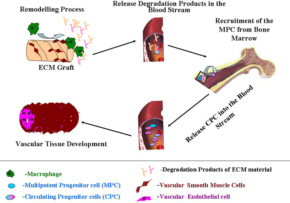 Chemoattractive bioactivity of ECM degradation products. During the ECM remodeling process (due to activity of macrophages, SMC), degradation products are released into the blood stream these recruit multipotent progenitor cells (MPCs) from bone marrow by chemoattractant activity of the peptides and degradation products. The circulating progenitor cells (CPCs) then migrate to the site of implantation and aid in the endothelisation process.