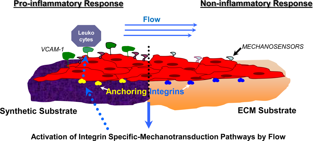 The effect of sub-endothelial substrate on the activation pattern of pro-inflammatory cellular mechanisms of mechanotransduction. This figure illustrates the biochemical processes induced by fluid shear stress for both a synthetic material and ECM scaffold material. As fluid flows across the EC layer (depicted in red), the mechanosensors at the endothelium surface sense the stress and react by transmitting signals through the transmembrane integrins (illustrated in red and blue). Specific integrin mechanotransduction pathways are thus activated, sending messages from ‘inside-out’ through specific integrins, triggering certain responses. Depending on which type of integrin is activated, various responses occur. Synthetic materials are prone to stimulate a pro-inflammatory response of adhered cell [] and exposed to the flow, in which presentation on the surface of vascular endothelium of adhesion molecules (for example VCAM-1) induce a subsequent attraction, rolling and adhesion and subsequent attachment of leukocytes to the site.