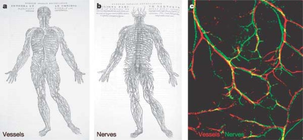 Illustration by the Belgian anatomist Andreas Vesalius, highlighting the similarities in the arborisation of the vascular and nervous networks. Vessels (red) and nerves (green). [], Copyright, Reprinted with permission from the Nature Publishing Group.