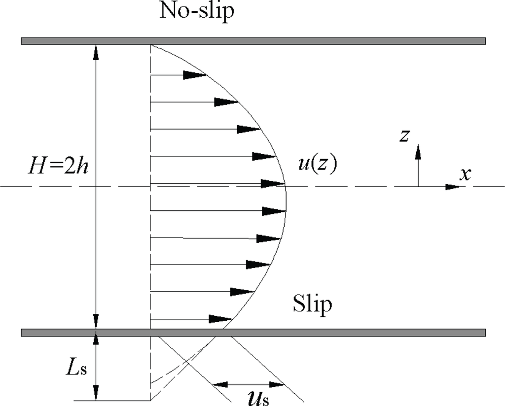 Studies on fluid mechanics at fluid-solid interfaces can be traced back to the early 19th century [34,35]. As early as in 1823, Navier pointed out that a fluid might slip on a solid surface, i.e., there is a velocity difference, called slip velocity, between the fluid and solid at a fluid-solid interface [36]. He also introduced the idea of ‘slip length’ to quantify the slip boundary condition. Thus, the slip velocity us is linearly related to the slip length Ls and interfacial shear rate by”
