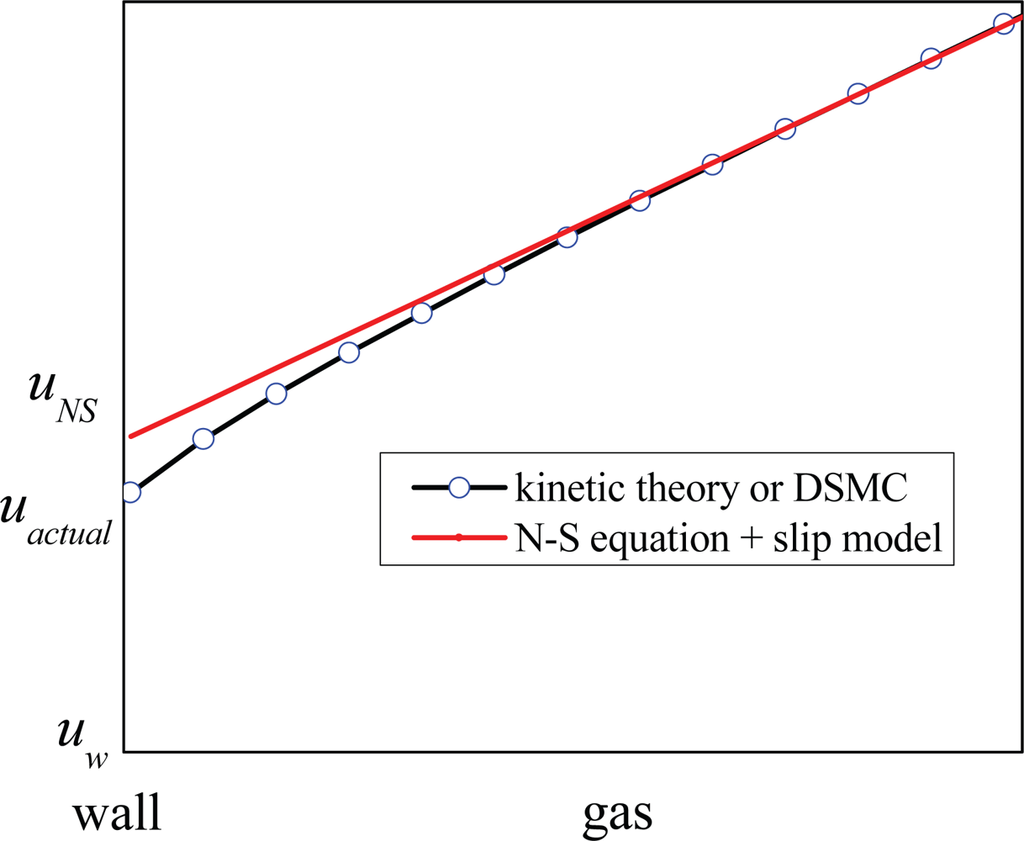 In linear slip models, the velocity slip is linear with the mean free path, in which the mean free path is constant along the channel’s height between two walls. The NS equations with linear slip models cannot describe the flow inside the Knudsen layer accurately, especially for large Kn gas flows, as shown in Figure 4. For the region far from the wall, the velocity profile predicted by NS equation with linear slip models agrees well with the results by the kinetic theory or DSMC method. While in the near wall region, the velocity profile predicted by the NS equations is different from that by the kinetic theory inside the Knudsen layer, and the velocity slip predicted by linear slip models (uNS , also called fictitious velocity slip [102]) is larger than that by the kinetic theory (uactual, the actual velocity slip). Schram [103] deduced that