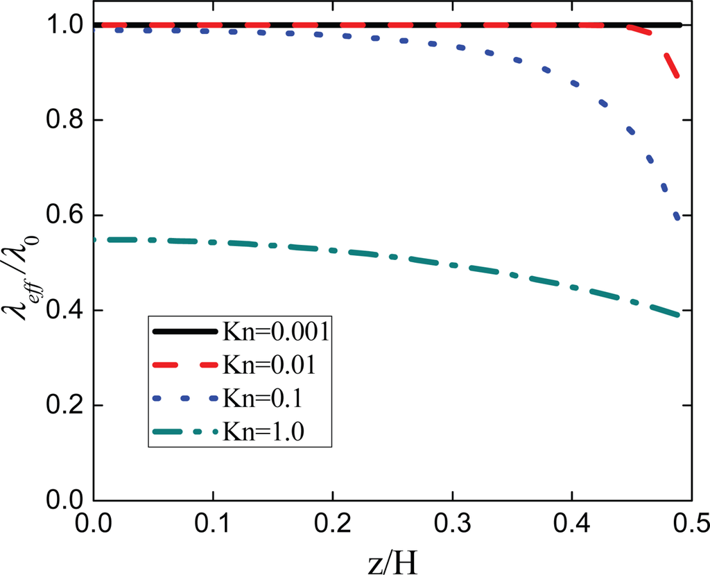 in which λ0 is the mean free path of gas flows with no bounding wall, z is the distance from the wall, and H is the distance between two separated walls. For different Kn, the wall effect on the mean free path is quite different, and the Knudsen layers enlarge from the near wall region and may overlap for large Kn, as shown in Figure 5.