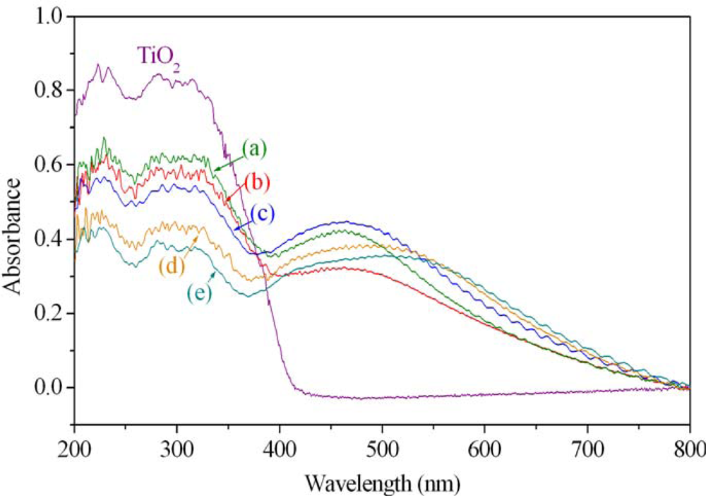 UV-Vis spectra of TiO2 and (a) 0.5, (b) 1.0, (c) 2.0, (d) 5.0, and (e) 10.0 wt% Ag in TiO2.