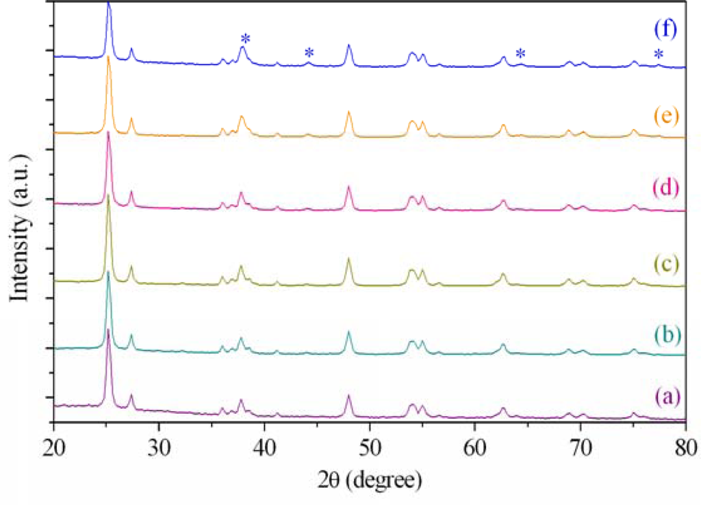 XRD patterns of (a) 0.0, (b) 0.5, (c) 1.0, (d) 2.0, (e) 5.0, and (f) 10.0 wt% Ag in TiO2. Ag signals were indicated by the asterisks.