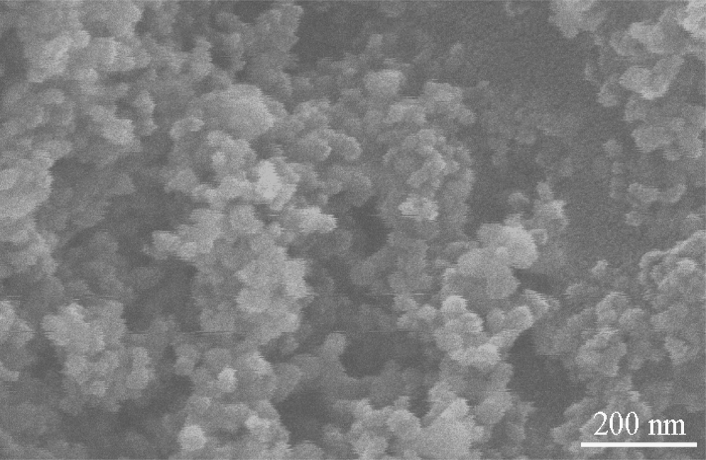 The SEM image of 2.0 wt% Ag/TiO2 nanoparticles is shown in Figure 3. Some porous surface dispersed among cauliflower-like clusters of grains was observed. The scope of particle size was measured to be approximately 30~45 nm. The results revealed that some aggregation of TiO2 grains occurs during laser-liquid interaction if we compare the particle size from SEM and from the XRD data calculation.