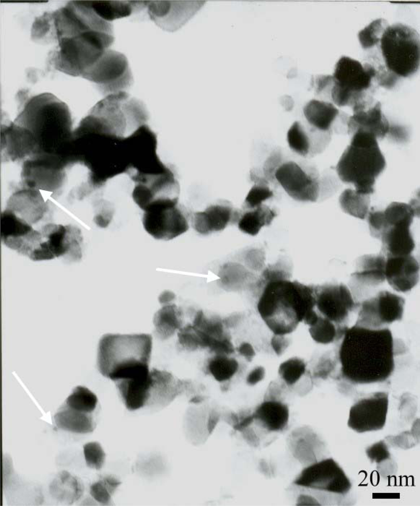 Figure 4 shows the TEM image of 2.0 wt% Ag/TiO2 nanoparticles. Small spherical Ag nanoparticles (some of these particles are indicated by arrows) were observed scattered on the surface of TiO2. For Ag particles, the diameter ranges from 3 to 6 nm, and the diameter of TiO2 was found to be in the scope of 20~40 nm. It suggests that small silver nanoparticles can be prepared by pulsed-laser irradiation applied to AgNO3 and TiO2 system, and that a good dispersion of these particles on the surface of the matrix is probable. The average diameter of particles from TEM image was found to be in accordance with the results of the SEM image.