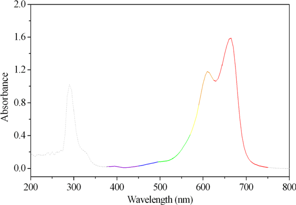 UV-Vis spectrum of methylene blue solution, with maximum absorption at 668 nm.