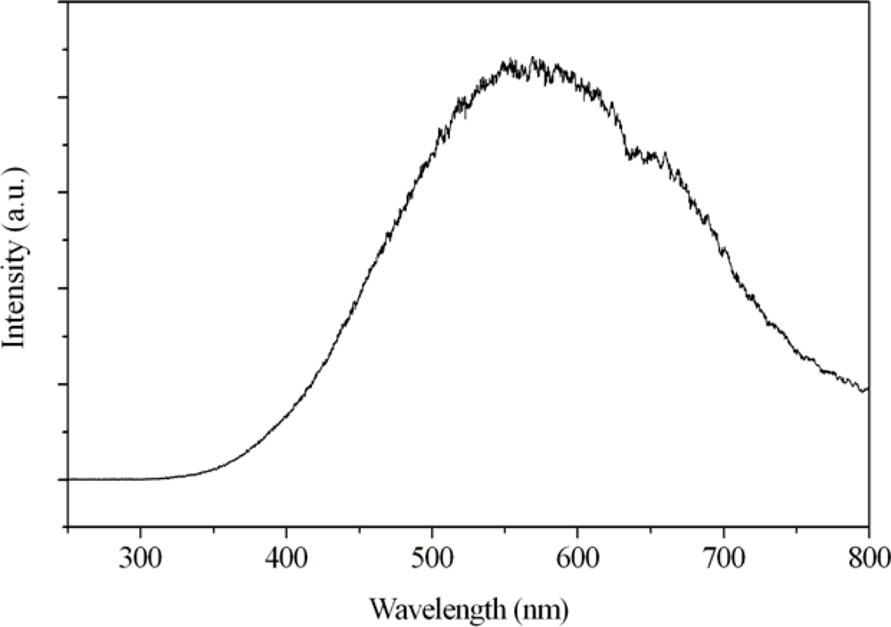 Figure 7 presents the light emitting spectrum of the halogen lamp applied in the degradation procedure, its emitting wavelength ranges from 350 nm to 800 nm with the predominant peak at 575 nm. The power of the halogen lamp is 150 W. Because the band gap of TiO2 is 3.0~3.2 eV, a wavelength greater than 387~414 nm will be short of any absorption by TiO2-only, as shown in Figure 1. If the photocatalysis of Ag/TiO2 in visible-light range improves through halogen lamp irradiation, it can be attributed to the absorption of visible light by Ag particles doped in the TiO2.