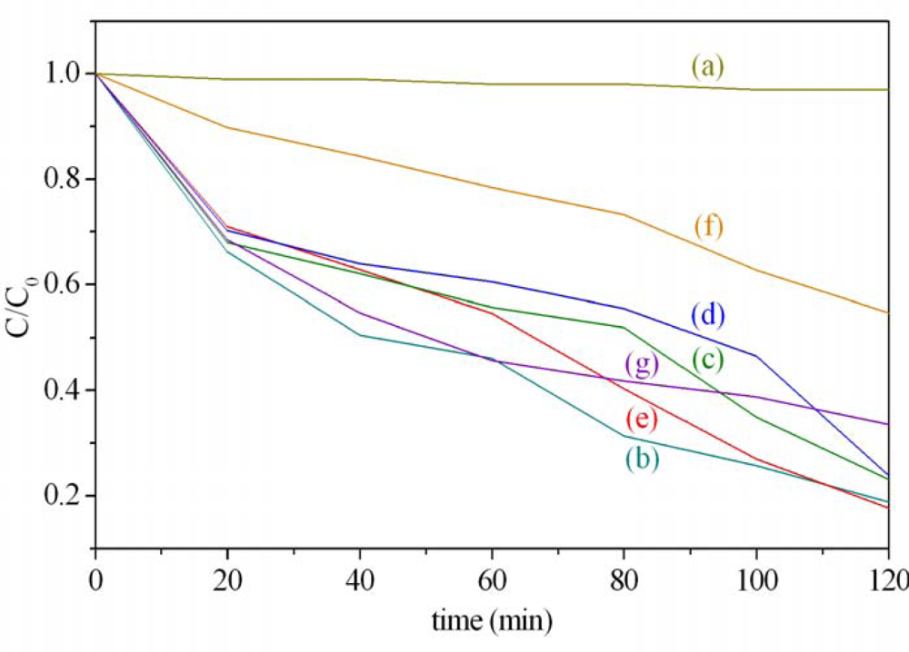 Photodegradation of methylene blue solution by using halogen lamp irradiation with (a) no catalyst, (b) 0.0, (c) 0.5, (d) 1.0, (e) 2.0, (f) 5.0, and (g) 10.0 wt% of Ag in TiO2.