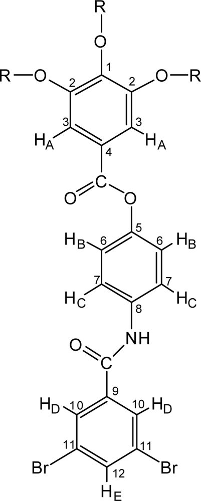 2.0 g (7.1 mmol) of 3,5-dibromobenzoic acid and 0.77 g (7.1 mmol) of p-aminophenol and a catalytic amount of N,N-dimethyl-4-aminopyridine (DMAP, ca. 50 mg) were added in 30 mL of THF. A solution of N,N′-dicyclohexylcarbodiimide (DCC, 1.47g, 7.1 mmol) in 20 mL of dichloromethane was added dropwise to an ice-cooled above mixture, and the reaction was continued for additional 30 min. Precipitated N,N′-dicyclohexylurea (DCU) was filtered off and the residual reaction mixture was added 1.5 mL of triethylamine (TEA), and then added dropwise 4.9 g (7.1 mmol) of 12G1-AG-Cl in 20 mL dichloromethane at room temperature for 30 min. Precipitated TEA-HCl salts were filtered off and the solvent was removed in vacuo and the residue was recrystallized from acetone. Yield, 85%. TLC (dichloromethane): Rf = 0.7. Mp 116.2 °C (DSC). 1H-NMR (CDCl3, δ, ppm) (Figure 1): 0.88 (t, 9H, CH3, J = 6.8 Hz), 1.26 (m, 48H, CH3(CH2)8), 1.49 (m, 6H, CH2CH2CH2OAr), 1.83 (m, 6H, CH2CH2OAr), 4.06 (m, 6H, CH2OAr), 7.16 (d, 2H, HC, J = 8.8 Hz), 7.40 (s, 2H, HA), 7.64 (d, 2H, HB, J = 8.8 Hz), 7.81 (t, 1H, HE, J = 1.9 Hz), 7.95 (d, 2H, HD, J = 1.9 Hz), 8.22 (s, 1H, NH); 13C-NMR (CDCl3, δ, ppm): 14.1 (CH3), 22.7 (CH3CH2), 26.0 (CH2CH2CH2OAr), 29.2 (CH3(CH2)2CH2), 29.6 (CH3(CH2)3(CH2)5), 30.3 (CH2CH2OAr), 31.9 (CH3CH2CH2), 69.0 (CH2OAr, C2 positions), 73.4 (CH2OAr, C1 position), 108.2 (C3), 121.4 (C6), 121.7 (C7), 122.9 (C11), 123.0 (C4), 128.9 (C10), 135.0 (C8), 136.5 (C12), 137.6 (C9), 142.7 (C1), 147.0 (C5), 152.5 (C2), 162.6 (ArCONHAr), 165.5 (ArCO2Ar); IR (KBr): 1730, 1640 (C=O), 1190, 1120 (-O-) cm−1. Anal. Calcd. for C56H85Br2NO6: C, 65.42%; H, 8.33%; N, 1.36%. Found: C, 65.33%; H, 8.25%; N, 1.33%.