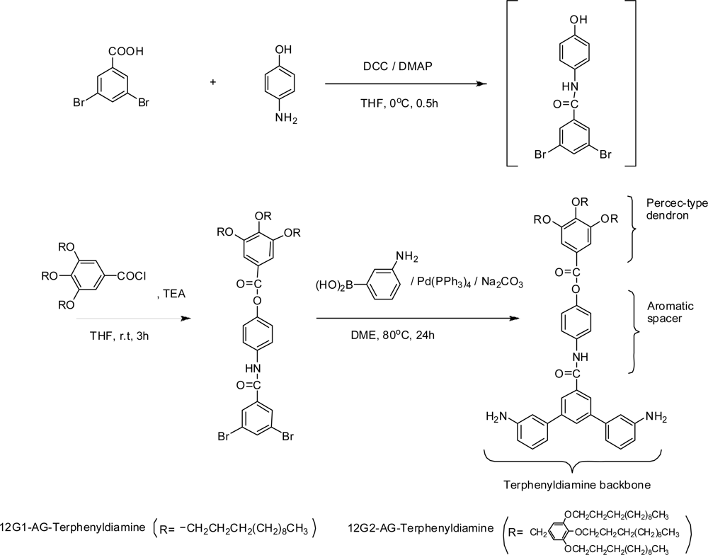 4-[3,5-Bis(3-aminophenyl)phenyl]carbonylamino]phenyl 3,4,5-tris(n-dodecyloxy)benzyloxy benzoate (12G1-AG-Terphenyldiamine) and 4-[3,5-Bis(3-aminophenyl)phenyl]carbonyl-amino]phenyl 3,4,5-tris[3’,4’,5’-tris(n-dodecyloxy)benzyloxy] benzoate (12G2-AG-Terphenyl diamine) were synthesized by the method shown in Figure 3 using the first- and second-generation Percec-type monodendrons.