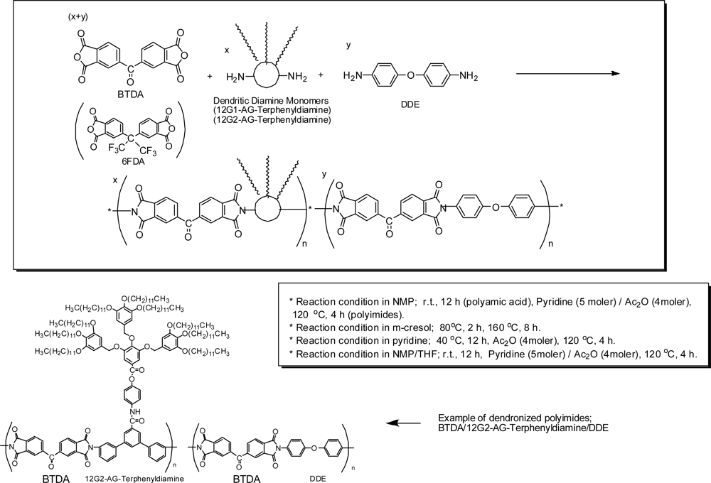 The synthesis route for the polyimides and copolyimides based on BTDA, 6FDA, DDE and dendritic diamines bearing long-chain alkyl groups (12G1-AG-Terphenyldiamin, 12G2-AG-Terphenyldiamin) is illustrated in Figure 4, and the results of polymerization are summarized in Table 1.