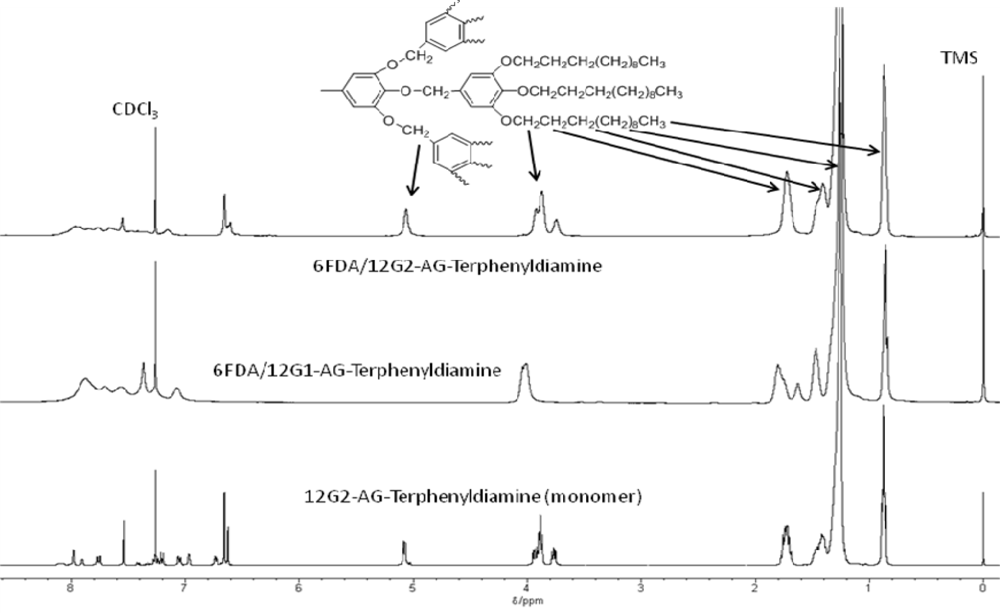 As four dendronized polyimides out of the seven soluble dendronized polyimides obtained from these experimental are soluble in chloroform (Table 2), 1H-NMR measurements using CDCl3 as a solvent and SEC measurements using chloroform as an eluent can be performed. For example, Figure 5 shows the 1H-NMR spectra of the polyimides based on 6FDA/12G2-AG-Terphenyldiamine, 6FDA/12G1-AG-Terphenyldiamine, and the monomer, 12G2-AG-Terphenyldiamine. As 1H-NMR spectra of polyimides shows broad peaks characteristic of a polymer NMR spectrum, the polymer formation is consequently confirmed. In the 1H-NMR spectrum of the polyimide based on 6FDA/12G2-AG-Terphenyldiamine, broad methylene proton peak of Ar-O-CH2-Ar existing in the second generation of dendoron appears, and the intensity of aromatic protons becomes very low in comparison with the peaks based on nine long-chain alkyl chains. Thus, the structures of dendronized polyimides were confirmed by 1H-NMR measurements.