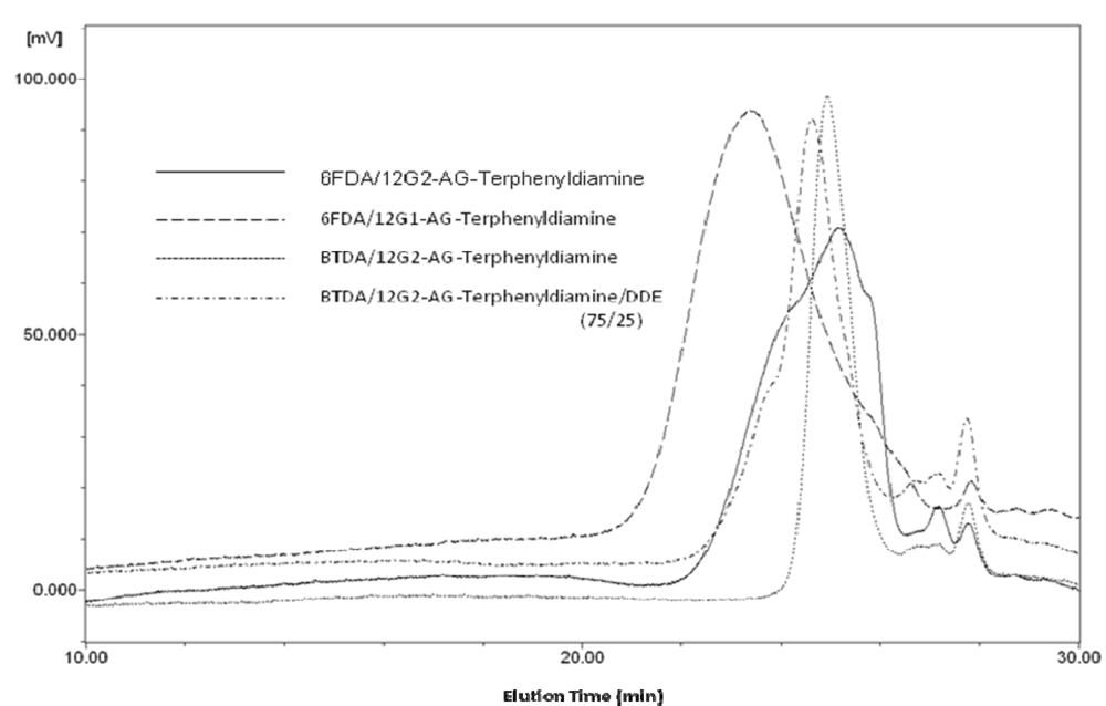 It is well known that 6FDA produces a soluble polyimide in combination with most aromatic diamines because of the effect of two trifluoro methyl groups. The polyimide based on 6FDA/12G1-AG-Terphenyldiamine was readily soluble in NMP, however 12G2-AG-Terphenyldiamine monomer itself was insoluble in NMP. Therefore, THF that have high affinity for hydrocarbon moiety was added, and the polyimide based on 6FDA /12G2-terphenyldiamine was eventually obtained in NMP/THF (1/1, volume ratio), using the same conditions as two-step polymerization systems in NMP (Table 1).