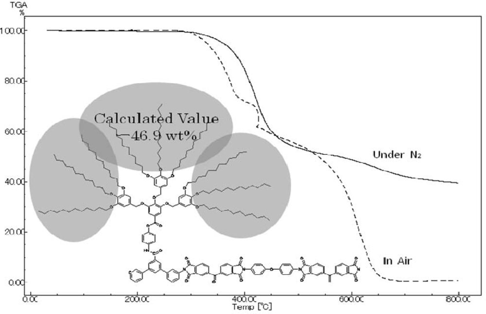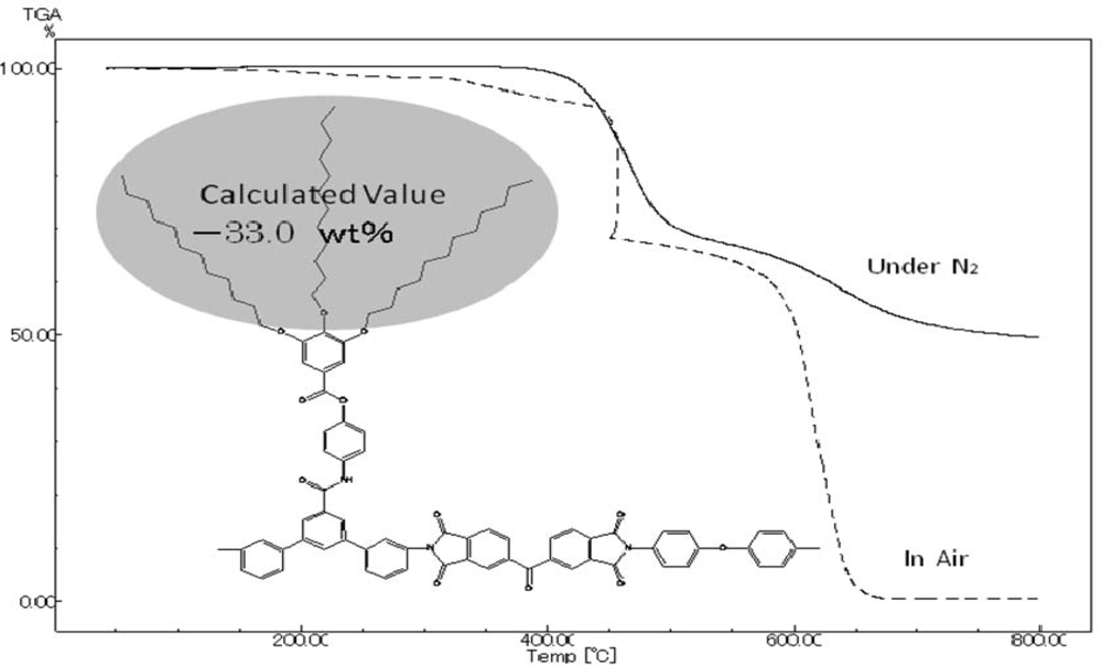 The Td10 values of these dendronized polyimides bearing long-chain alkyl groups in Table 3 were in the range 349~455 °C in air and 375~449 °C under nitrogen, showing similar values observed in soluble polyimides obtained from our laboratory (ca. 400~500 °C). Although these Td10 values of the polyimides obtained in our laboratory are 100~200 °C lower than those of wholly aromatic polyimides; however, these soluble dendritic polyimides based on 12G1-AG-Terphenyldiamne and 12G2-AG-Terphenyldiamine still can be ranked as heat resistant polymers. Figures 8 and 9 show the TGA traces of dendronized polyimides based on BTDA/12G1-AG-Terphenyldiamine (100/50/50), BTDA/12G2-AG-Terphenyldiamine (100/50/50), respectively. These TGA traces showed steep weight loss at the intial stage of degradation, and these weight loss percent almost correspond the calculated value of the weight percent of alkyl groups in polymer segments. Therefore, it is considered that the degradation of long-chain alkyl groups occurred at the initial stage of thermal degradation. Furthermore, these TGA traces also show the evidence that the long-chain alkyl groups exist in the polyimides and the cleavage of alkyl groups did not occurred during the polymerization.