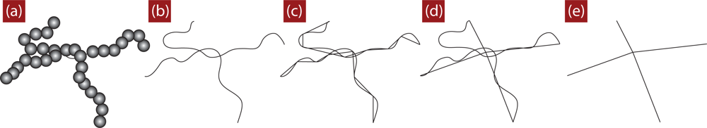 The primitive path of an individual chain is mainly characterized by its contour length Lpp and end–to–end distance R. The application Z1 provides not only these quantities, but information about the number of kinks. A number of possibilities are shown, where two (a,b) and three (c,d,e) chains meet, respectively. Cases (b) and (c) we call multiple entanglement events. In (a) and (d), one or more kinks meet a straight line.