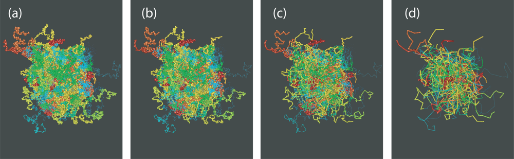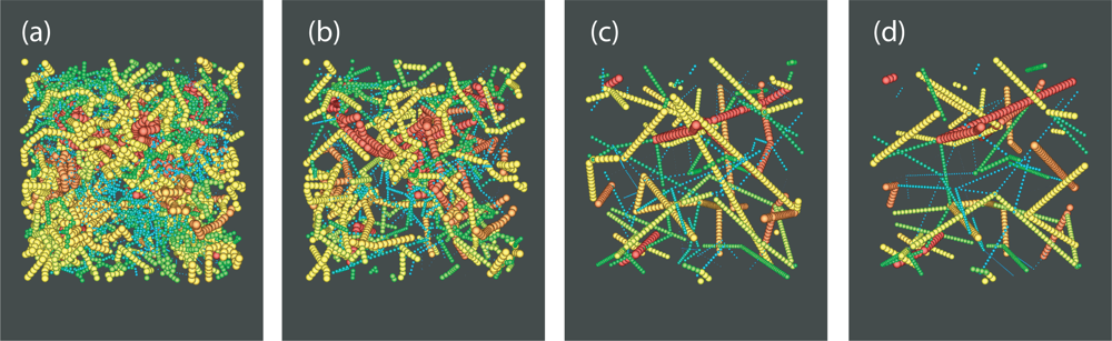 Snapshots made during runtime of the Z1 code [,]. (a) The original configuration, shown in unfolded representation (and belonging to the set denoted as “large φ = 0.60” in Table 1) is (b–c) subjected to geometrical transformation which monotonously decrease the length of the multiple disconnected path until (d) the length of the path (denoted as primitive path network) has reached a minimum. The whole operation requires about a single CPU second on a single processor.