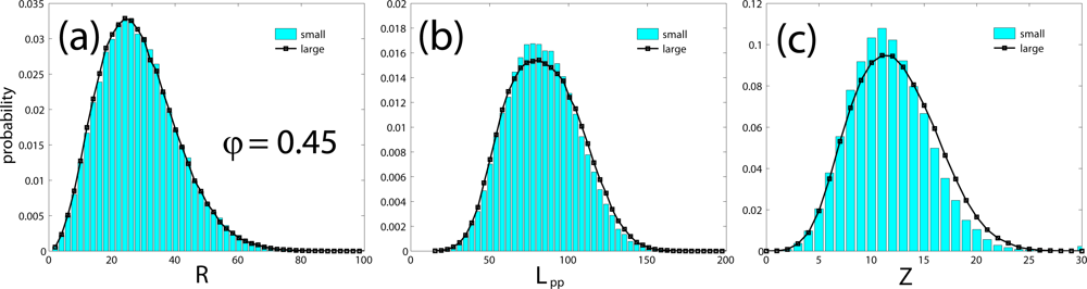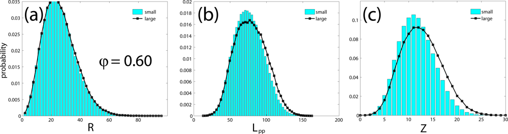 Within the Z1 code periodic images of the same chains are treated as different chains, while all parts of a physically connected chain (which may cross the border of the simulation box) are treated as belonging to the same chain. The minimization procedure terminates as soon as the mean length of the primitive paths, ⟨Lpp⟩, has converged. Self entanglements are neglected in the mentioned sense, and their number is often considered small and inconsequential for polymeric systems [] although a more detailed analysis on the role of self-entanglements may be required for very dense packings of exceedingly long chains. Finite size effects for the counting of entanglements (cf. Sec. 4.3.) can however not be prevented to set in when the chain dimension and mesh size of the PP network exceeds the box size. Structural quantities like the structure factor or the end-to-end distance are seen to be less affected, under melt conditions: See Figures 12a (φ = 0.45) and 13a (φ = 0.60) which show the probability distribution for end-to-end distances R, obtained from a long MC trajectory for both “small” (6 chains) and “large” (162 chains) systems. The corresponding histogram for the lengths of the primitive paths, ⟨ Lpp⟩, is drawn in Figures 12b and 13b. Discrepancies between small and large system are clearly visible, but remain minor, on the level of the length of the shortest path. The apparent differences can be traced back to polydispersity effects, rather than finite size effects, as we will demonstrate below.