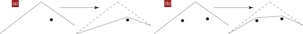 Central routine of the Z1 code finds the shortest path for two adjacent segments (solid lines) in the presence of none, one (a), two (b), or more obstacles. Each obstacle correspond a point which belongs to the contour of a different chain (not shown), and which intersects with the plane spanned by the two segments. Z1 locates potentially intersecting points efficiently, and operates at a variable number of nodes characterizing the shortest path. The central routine is iteratively applied to all pairs of adjacent segments until the multiple disconnected path has converged to a minimum length. The algorithm scales linearly with the total number of particles.