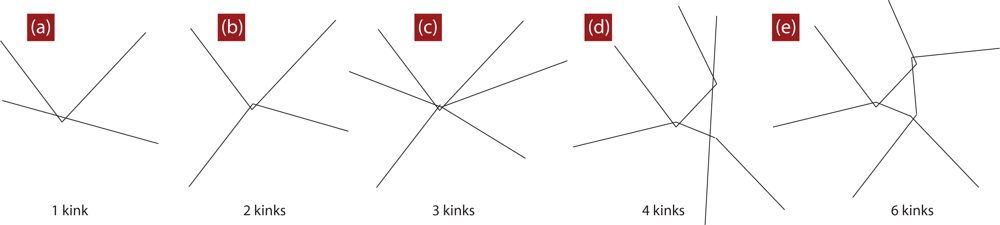 Obviously, a number of kinks then corresponds to the number of changes in direction along the PP, but does not inform us on how many chains contributed to their existence, see Figure 15. All kinks are a result of at least two chains interacting, while chains can also interact without producing kinks on all (at least two) involved paths. A PP can only bend if there is at least one chain obstructing it. And in the general case there are kinks where two, three, or more chains exactly meet at a kink. Within the above mentioned picture of a step length, which requires a single chain model, this also does not matter. It matters only if we want to understand if the number of chains entangled with a given chain is larger than the number of kinks, which is possible for several physical cases, but improbable for others. First of all, PPs of several (say x) chains could meet in the same point in space, cf. Figure 15. If we assume that all involved PPs exhibit a kink at this point, we would have x interior kinks due to a multiple entanglement with x chains (Figure 15b–c). If all kinks were originated by twin events, and if the same chains would not exactly meet in the same point in space, but still would be all entangled, we would count 2x interior kinks (Figure 15e). Secondly, a straight segment can give rise to a kink on a neighboring chain, so that such an entanglement would have a single kink in total (Figure 15a), and less than 2x kinks, in general (Figure 15d) while a mutual entanglement, where both chains bend, has two kinks (Figure 15b). From this discussion it is clear that there is some information missing between number of interior kinks and number of entangled chains, while the former alone is used to define a step length of the PP. Because chains do not slide past each other within the Z1 code, the probability for a multiple entanglement (Figure 15c), where all chains bend at the entanglement point is expected to be small. It is simple to invent other measures, but all of them will be lacking a connection to truly topological quantities in a strict mathematical sense.
