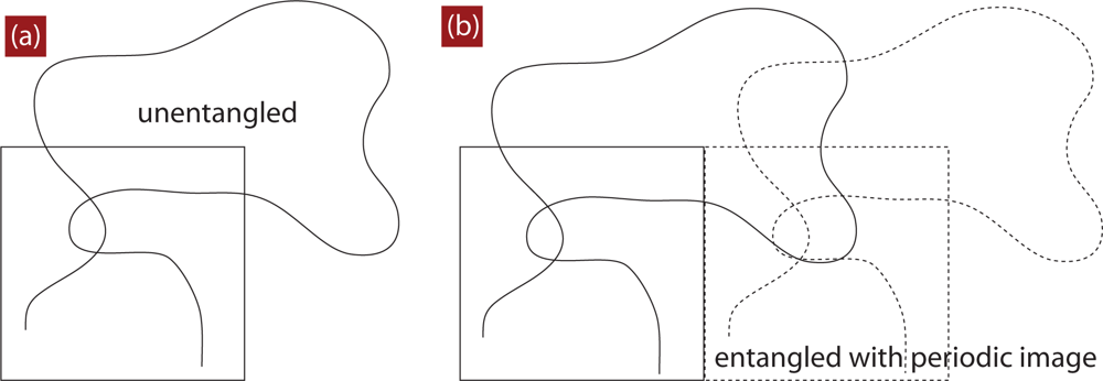 There is, in addition, an issue to be discussed which is relevant if the system size is small compared with the size of the chains. This issue had not been thoroughly addressed in the literature, and gives rise to confusion whenever computational resources are not sufficient to study a large enough system. As already mentioned, within the Z1 code periodic images of the same chains are treated as different chains, while all connected parts of a chain belong to the same chain, regardless of its size compared to simulation box size, see Figure 16. Self-entanglements have to be excluded from the analysis, as per original definition of the PP. It is thus important to keep information about connectivity during the PP analysis. Still, the results are prone to be biased in several respects, if chains sizes exceed system sizes, but the above choice attempts to minimize the bias. Other issues like the so–called correlation hole (see, e.g., []) potentially enter the discussion about self–entanglements and system–size effects.