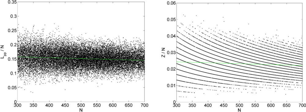 There are remarkable and important deviations between the statistical properties of weakly entangled and infinitely long, infinitely entangled, chains, i.e., between the regime where Z is not yet proportional to N, and the regime where it has approached this scaling behavior, which must ultimately happen for uniform, linear chains. These differences have been addressed recently by Hoy et al. in []. They reviewed earlier estimators and proposed new ones, for both the case where information about kinks (Z) is available, and the one where Ne is estimated based on ⟨Lpp⟩ and ⟨R2⟩. The main findings were: (i) Ne is best obtained from the linear variation of Z with N, i.e., by assuming Z = Z0 + N/Ne with two coefficients Z0 (which should be negative) and Ne, the entanglement molecular weight; (ii) One has to take into account the characteristic ratio CN when estimating Ne using Lpp values. The entanglement molecular weight appears here because it is defined to be the ratio between ⟨N⟩ and ⟨Z⟩, in the limit of large ⟨N⟩. The quantity Z0 reflects the fact, that a minimum amount of material is required to produce a single entanglement. We expect it to depend on the molecular details of the model and state variables such as temperature, which influence, e.g. the flexibility of chains. Upon applying the proposed procedure, we can evaluate a corrected value for Z, denoted as Z*, which is free from both polydispersity effects and effects of finite chain length via